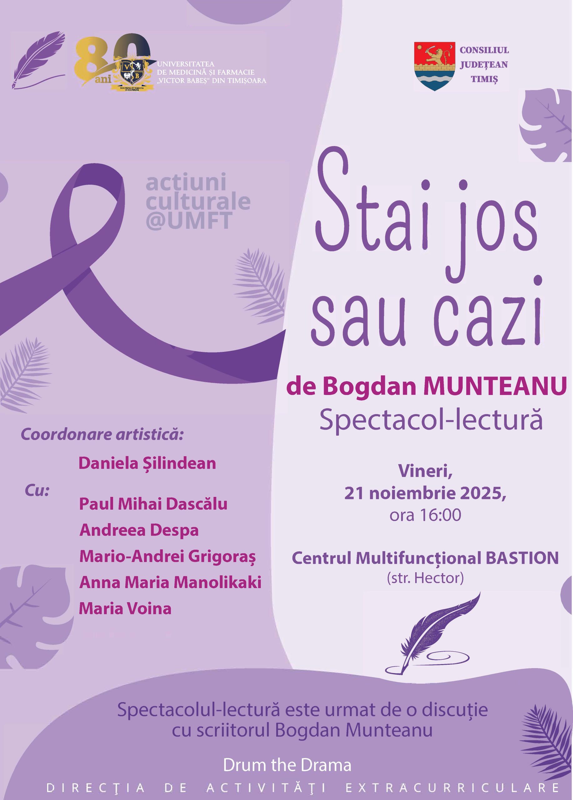 La o nouă ediție a programului de acțiuni culturale de la Universitatea de Medicină și Farmacie din Timișoara va avea loc în luna noiembrie un spectacol-lectură după romanul „Stai jos sau cazi” al scriitorului Bogdan Munteanu.