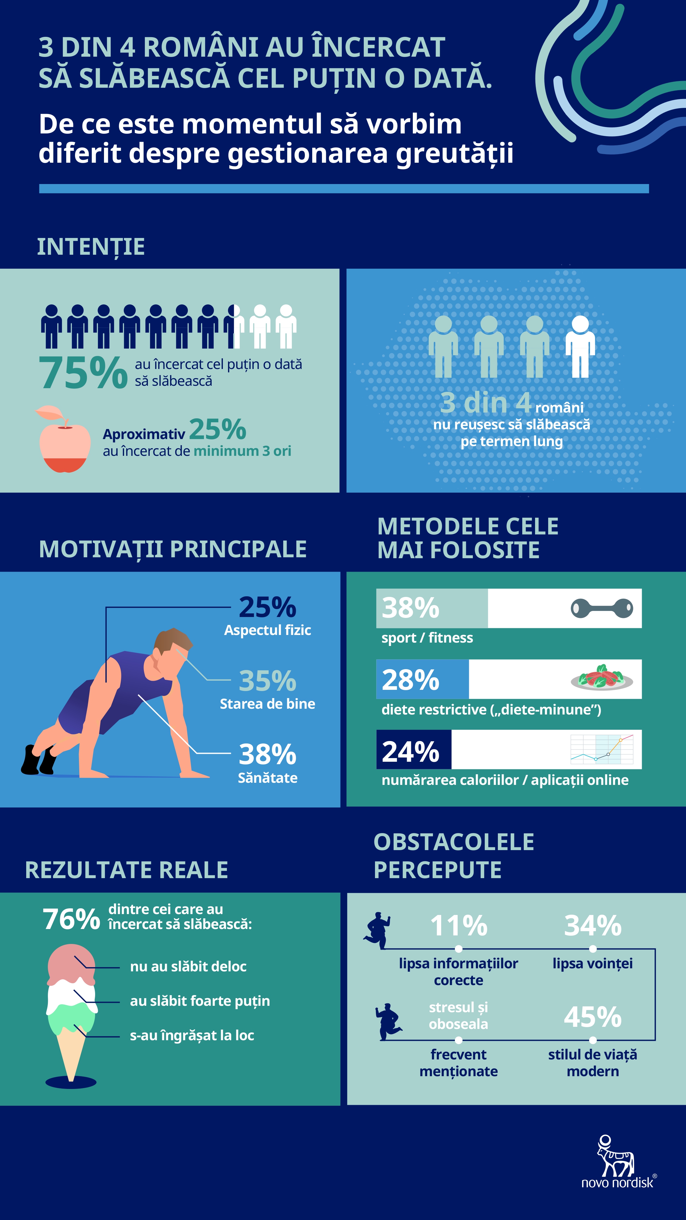 Principalele motive pentru care românii își doresc să prioritizeze slăbitul sunt sănătatea (40%), starea de bine (34%) și aspectul fizic (25%). Totuși, realitatea evidențiată de date este una îngrijorătoare: pentru majoritatea celor care au încercat să slăbească, rezultatele au fost inexistente (12%), minime sau nesustenabile (38%), kilogramele pierdute fiind recâștigate în timp (26%). Acest lucru indică dificultatea menținerii scăderii în greutate pe termen lung.