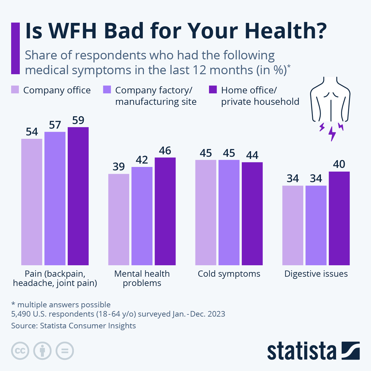 Următorul grafic folosește date dintr-un sondaj intitulat „Statista Consumer Insight”, care și-a propus să afle cât de mult diferă starea de sănătate raportată de respondenți în rândul persoanelor care lucrează în cea mai mare parte a timpului de acasă, în comparație cu persoanele care lucrează la birou sau într-o fabrică. În urma sondajului s-a descoperit că șase din zece adulți din SUA care lucrează în principal de acasă au experimentat un tip de durere – fie că era vorba de durere de spate, durere articulară sau o durere de cap – în cele 12 luni anterioare participării la sondajul de opinie. Aceste simptome au apărut mai frecvent în cazul acelor persoane care lucrau de acasă decât la acele persoane care lucrau dintr-un mediu precum biroul (59% în comparație cu 54%). O proporție ușor mai mare a persoanelor din grupul WFH a raportat, totodată, ca a suferit de probleme digestive, chiar dacă diferența a fost una mică (37% în comparație cu 34%).