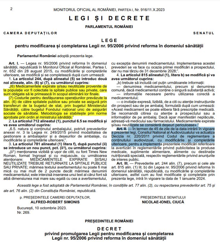 Anunțul a fost făcut de Colegiul Farmaciștilor București, care a postat și linkul către Monitorul Oficial al României nr. 916 din 11 octombrie 2023 (paginile 1-2) cu decizia care reglementează colectarea medicamentelor expirate.