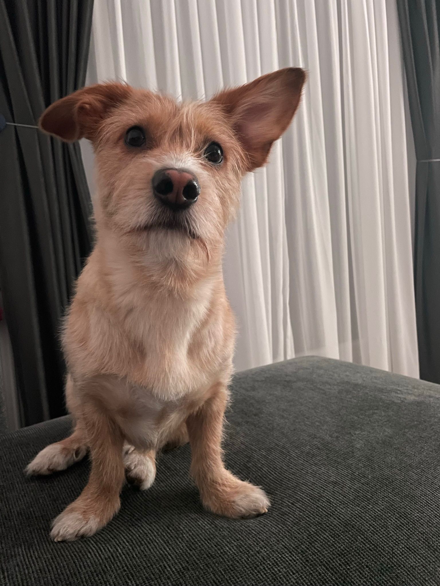 Am un cățel de talie mică numit Bruny. Este un metis, în vârstă de trei ani și jumătate, care face parte din familia noastră din februarie 2020.
