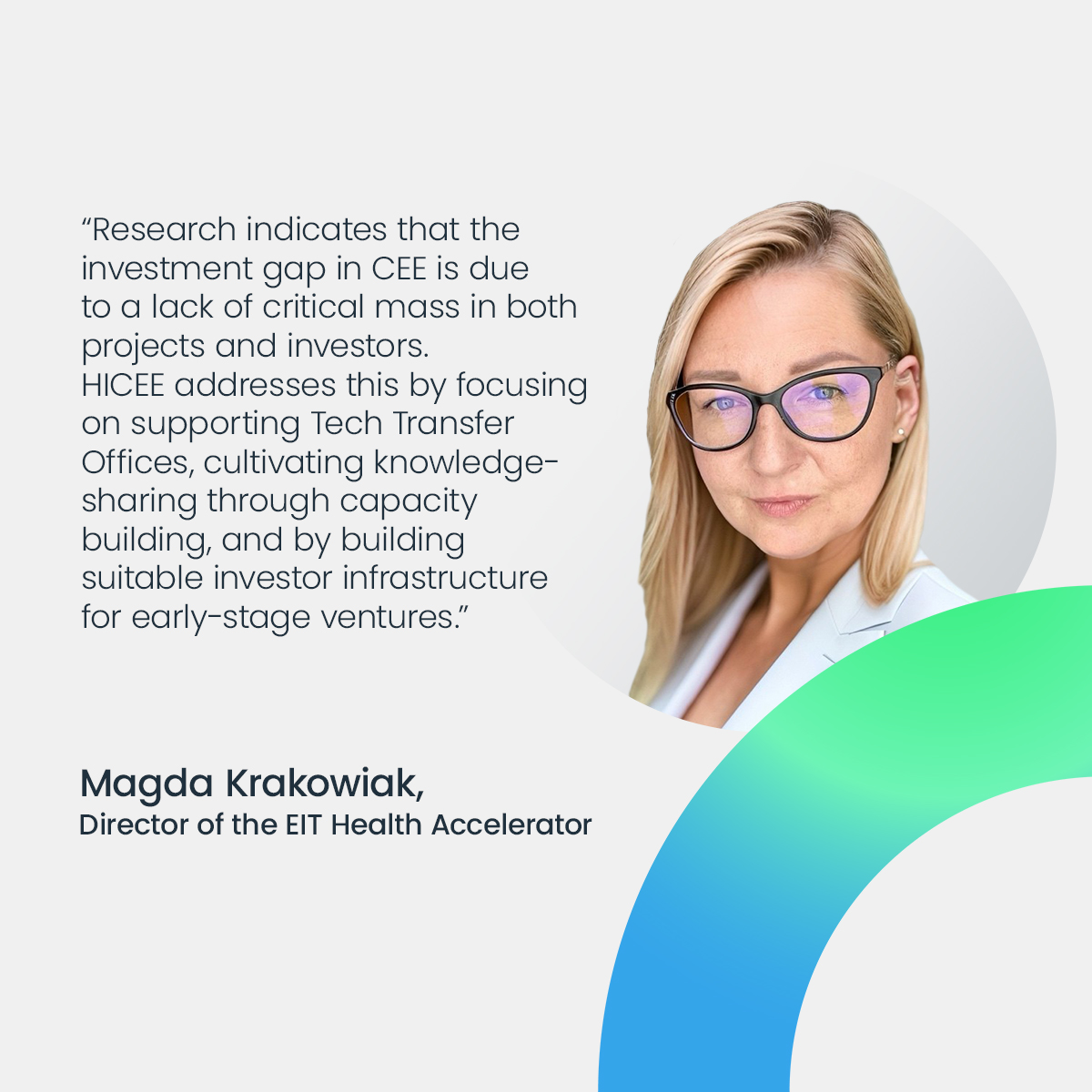 „Cercetările indică faptul că deficitul de investiții în regiunea Europei Centrale și de Est se datorează lipsei unei mase critice atât în ceea ce privește proiectele, cât și investitorii. HICEE abordează acest aspect prin sprijinirea birourilor de transfer tehnologic, prin cultivarea schimbului de cunoștințe, prin consolidarea capacităților și prin crearea unei infrastructuri de investitori, adecvate pentru start-up-uri. Programul recunoaște provocările specifice cu care se confruntă start-up-urile din domeniul sănătății și al științelor vieții și urmărește să ofere părților interesate cunoștințe necesare pentru o transpunere, cu succes, pe piață”, a explicat Magda Krakowiak, director al acceleratorului EIT Health Accelerator.