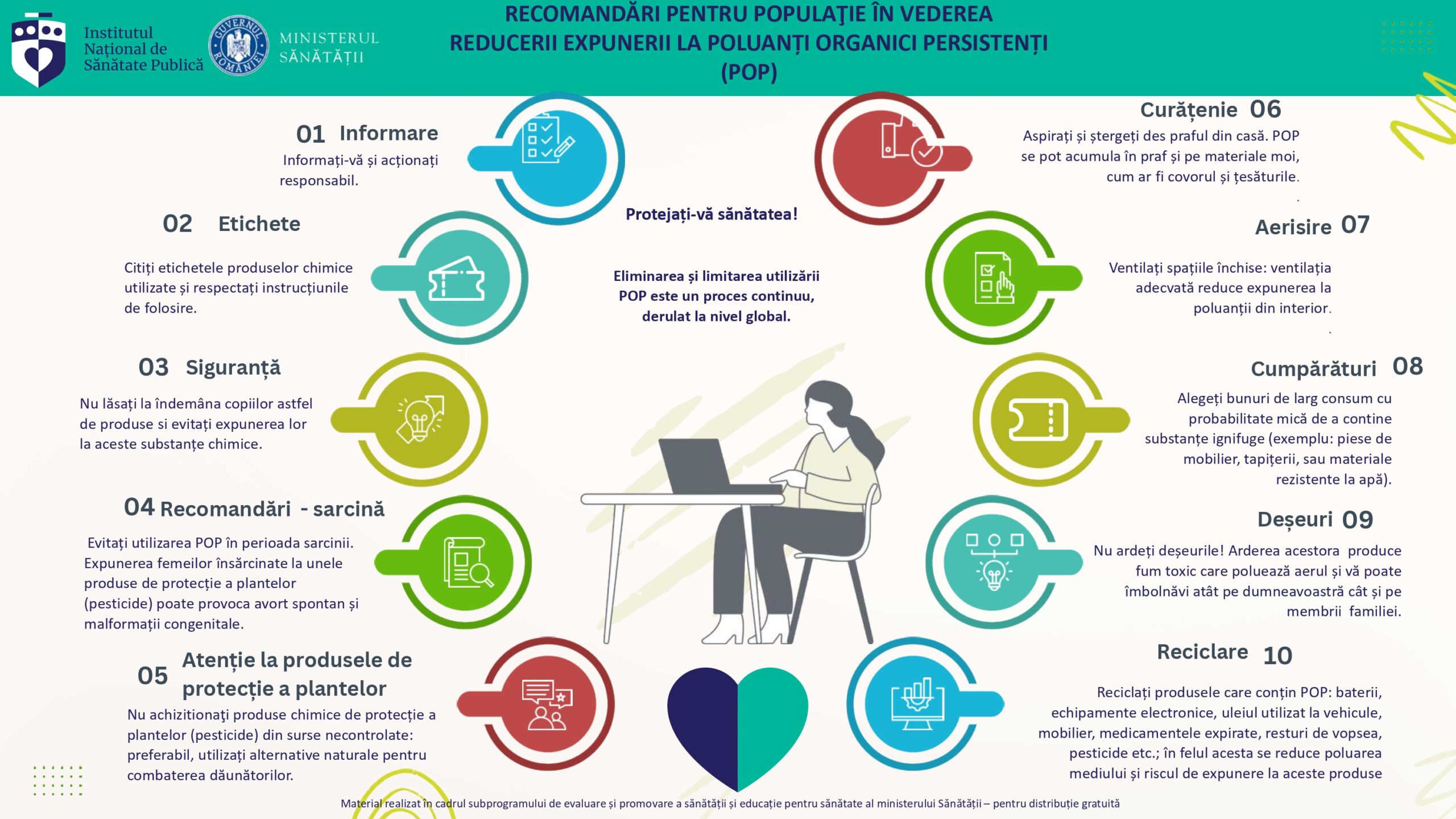 Activităţile de informare ale Institutului Național de Sănătate Publică (INSP) din acest an cu privire la efectele nocive ale poluanţilor organici persistenţi (POP) se desfășoară sub sloganul „Expunerea la poluanții organici persistenți scade calitatea și durata vietii! Protejează-ți sănătatea!”.