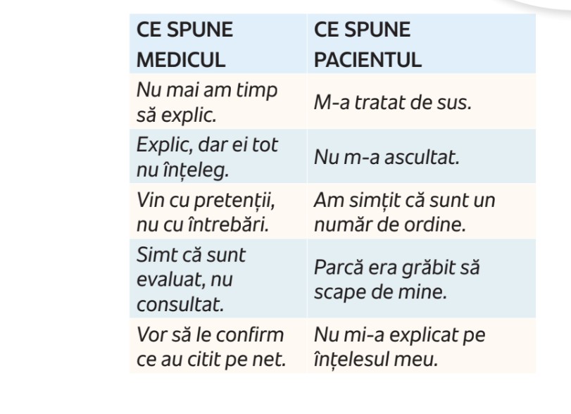 În practica mea de coach și în conversațiile cu medici din diverse specialități, respectiv cu pacienti, aud frecvent aceleași frustrări precum cele formulate în tabel.