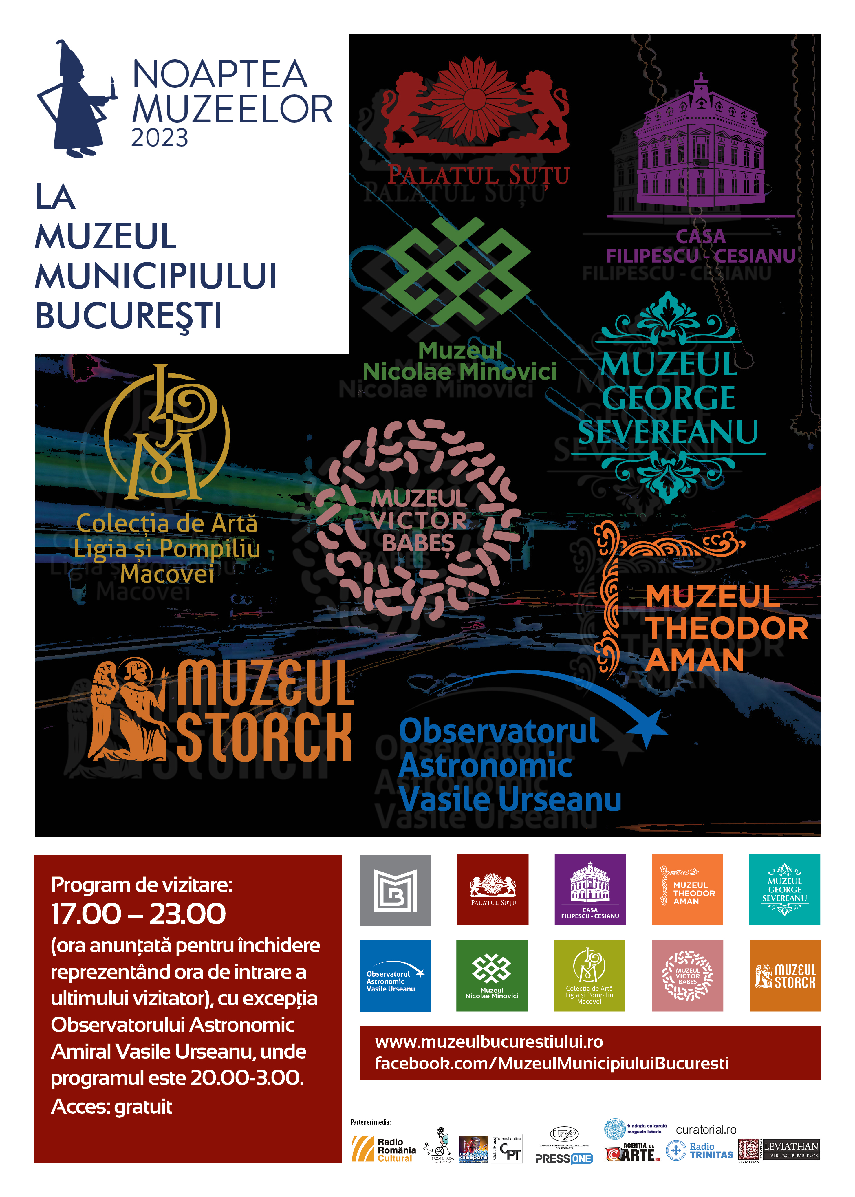 De Noaptea Muzeelor, Muzeul Municipiului București (MMB) va întâmpina publicul cu variate și incitante expoziții care se vor putea vizita gratuit, precum și cu reprezentații teatrale și concerte. Programul de vizitare va fi între orele 17:00-23:00. La Observatorul Astronomic Amiral Vasile Urseanu programul este diferit: va fi deschis între orele 20:00 – 03:00. Orele anunțate pentru închidere reprezintă ora de intrare a ultimului vizitator, se arată într-un comunicat de presă transmis redacției.