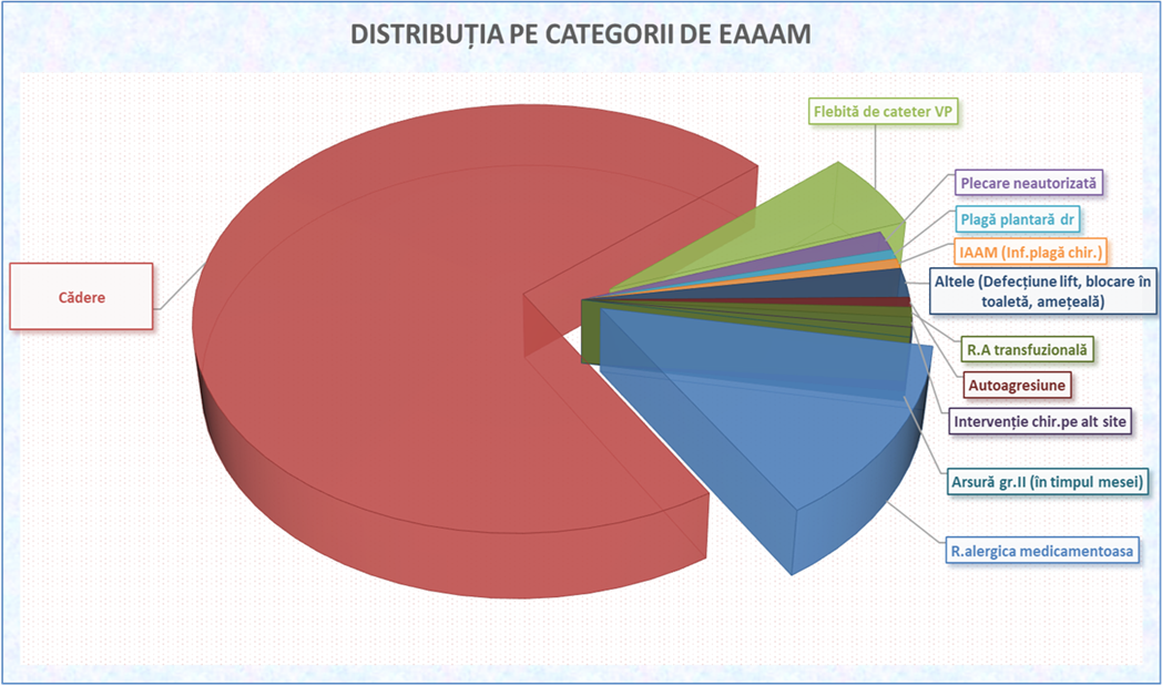 Evenimentele adverse raportate au fost legate predominant de asistența medicală: căderi (73%), reacții alergice medicamentoase (13%), flebită de cateter venos periferic (6%), plecare neautorizată (1%), reacție adversă transfuzională (1%), infecție plagă chirurgicală (1%).