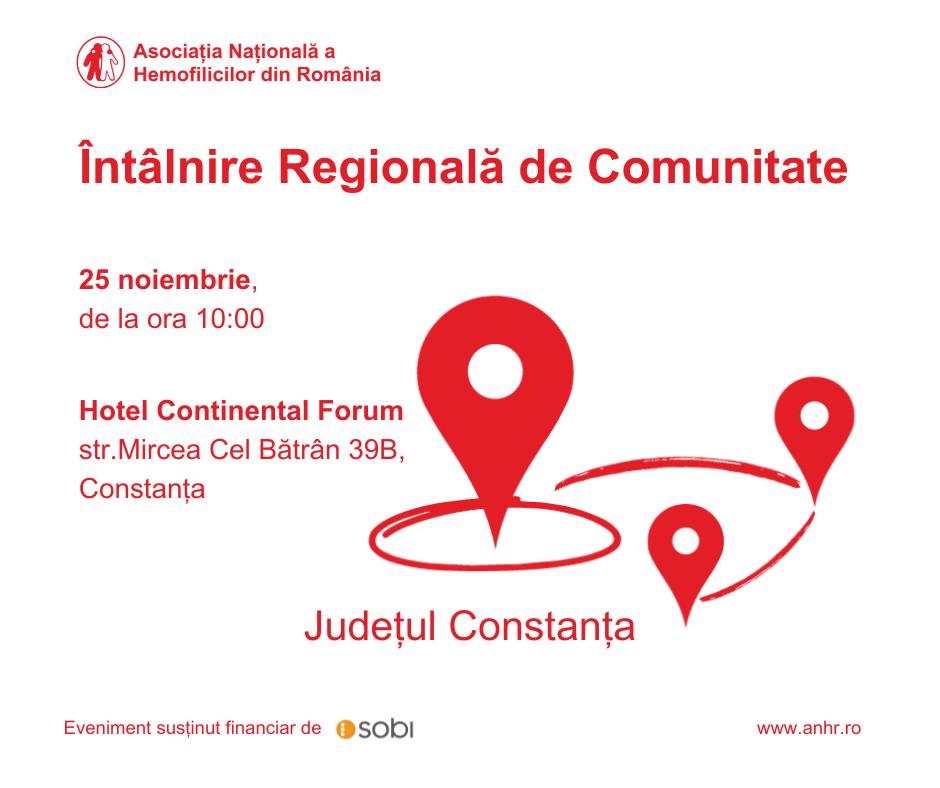 Asociația Națională a Hemofilicilor din România vă invită sâmbătă, 25 noiembrie, la „Întâlnirea Regională de Comunitate” pentru județul Constanța.