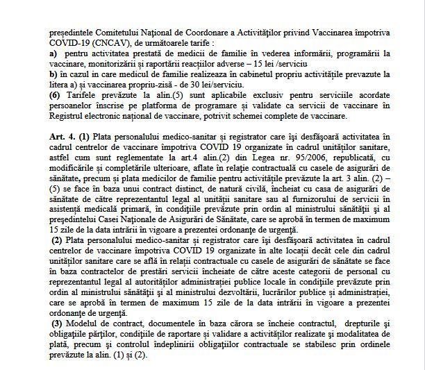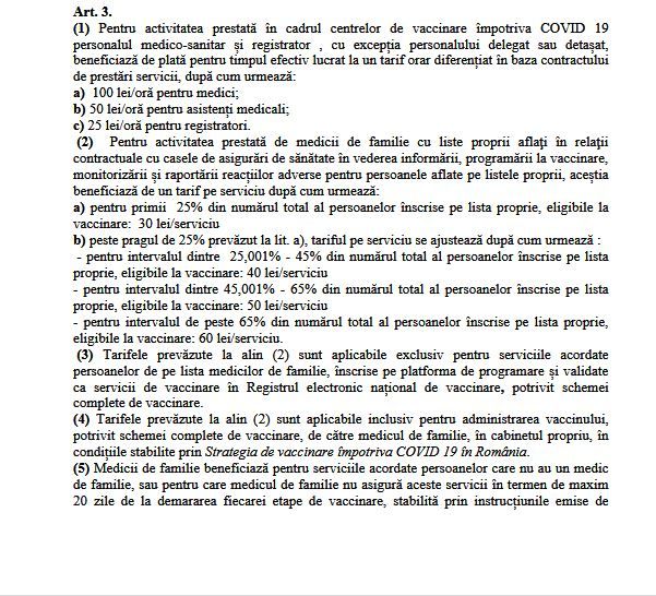 „Tarifele prevăzute la alin (2) sunt aplicabile exclusiv pentru serviciile acordate persoanelor de pe lista medicilor de familie, înscrise pe platforma de programare și validate ca servicii de vaccinare în Registrul electronic național de vaccinare, potrivit schemei complete de vaccinare. Tarifele prevăzute la alin (2) sunt aplicabile inclusiv pentru administrarea vaccinului, potrivit schemei complete de vaccinare, de către medicul de familie, în cabinetul propriu, în condițiile stabilite prin Strategia de vaccinare împotriva COVID 19 în România”, se arată în proiect.
