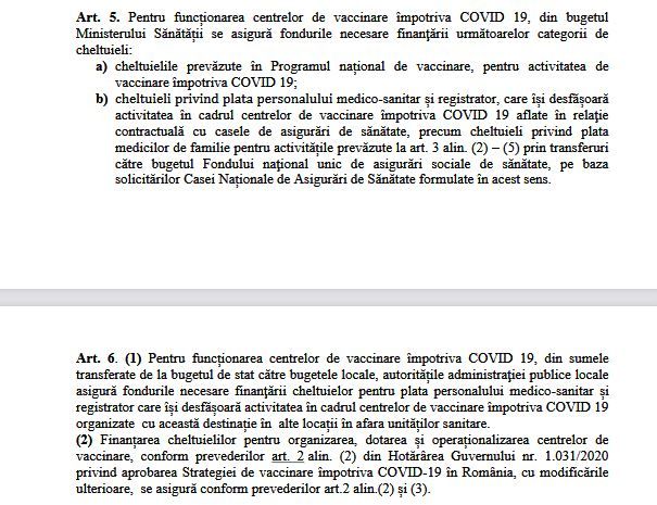 Totodată, proiectul de Ordonanță arată că cheltuielile curente și de capital în vederea operaționalizării centrelor de vaccinare împotriva COVID 19 se asigură de la bugetul de stat, prin bugetul Ministerului Sănătăţii, în limita sumelor aprobate cu această destinaţie prin legile bugetare anuale, prin transferuri către bugetele locale prin introducerea unui nou articol bugetar la Cap 66.01 „Sănătate”.