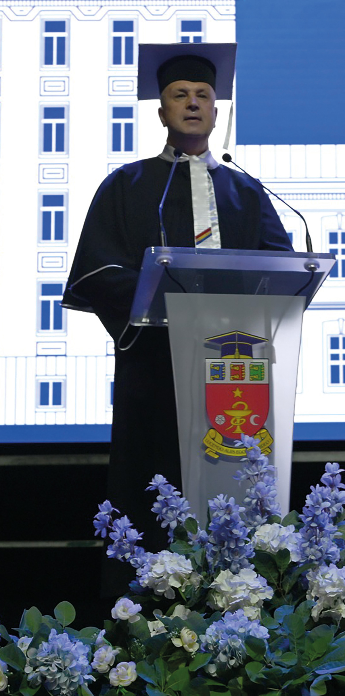 Pe tot parcursul ceremoniei, rectorul USMF le-a adresat absolvenţilor mai multe mesaje pline de miez. În debutul evenimentului, acesta i-a asigurat pe viitorii medici că au toate cunoștinţele necesare și capacitatea de a-și croi o carieră de succes în Medicină: „Este un moment de sfârșit și, totodată, un nou început, cu noi provocări ce vă așteaptă. Avem certitudinea că veţi deveni specialiști de valoare indiferent de ţara în care veţi profesa. (...) Prin depunerea jurământului vă angajaţi să aveţi grijă de sănătatea și bunăstarea întregii societăţi care își pune în voi speranţele sale de sănătate fizică și morală”.