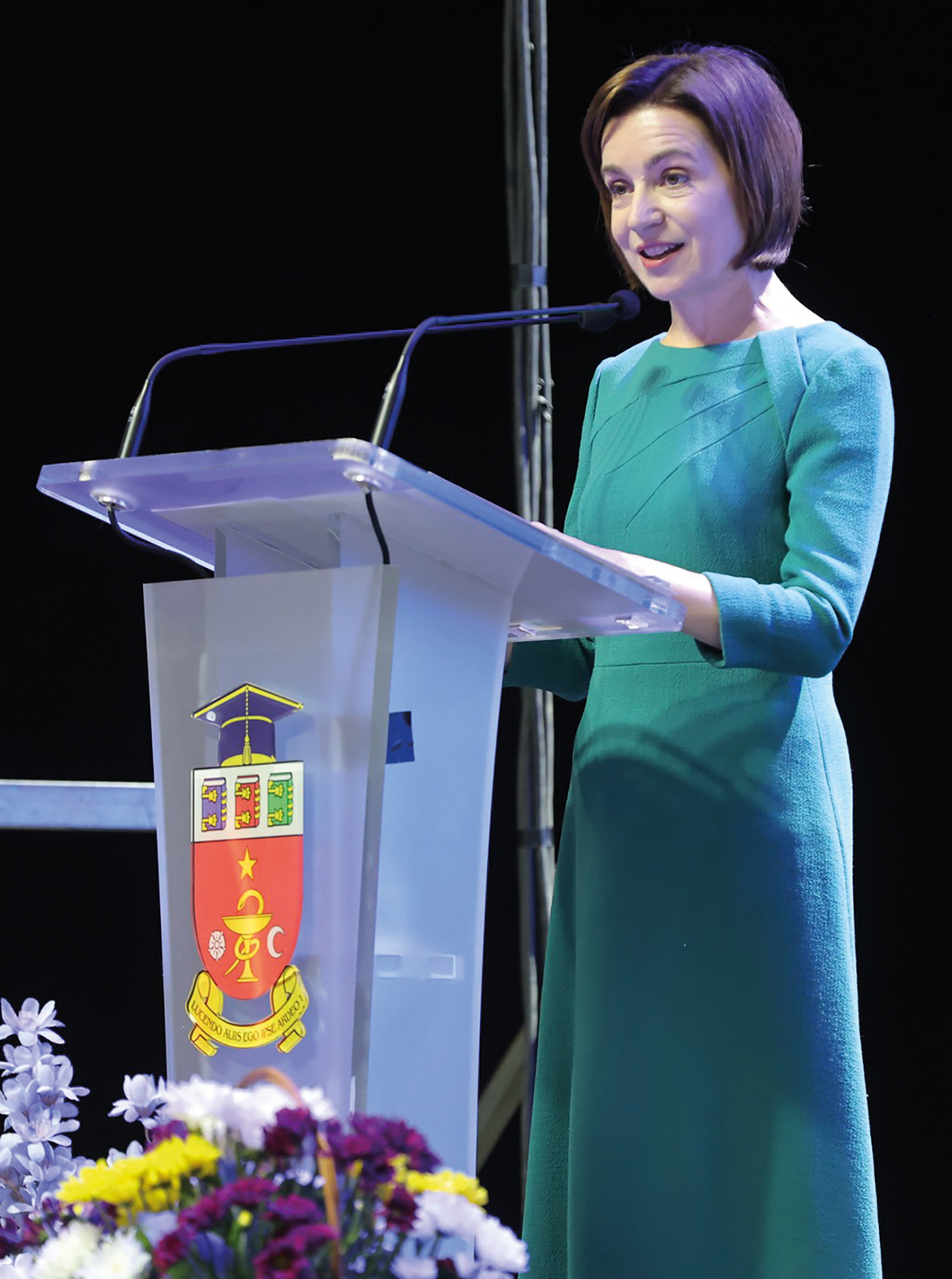 Vorbind parcă la unison, reprezentanţii autorităţilor i-au îndemnat pe absolvenţii promoţiei 2024 să fie încrezători și să-și exprime opiniile, dar și să rămână în Republica Moldova pentru a contribui la îmbunătăţirea sistemului de sănătate din această ţară. Maia Sandu (foto), președinta Republicii Moldova, a subliniat importanţa profesiilor de medic și farmacist, evidenţiind, totodată, contribuţia pe care absolvenţii o pot aduce în parcursul viitor al ţării:
