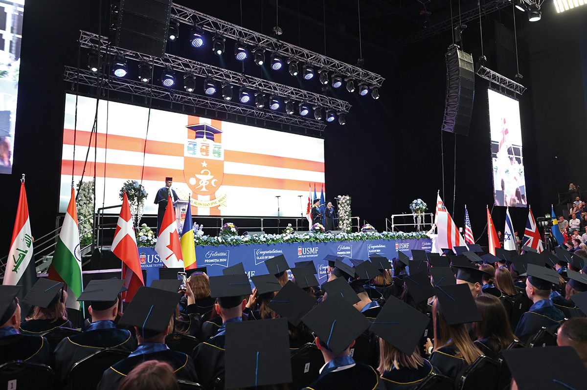 Ceremonia a debutat cu un cuvânt de bun-venit rostit de prof. dr. Emil Ceban, rectorul USMF, urmat de prezentarea drapelelor statelor din care provin cei 421 de absolvenţi străini ai promoţiei 2024. Între acestea se numără România, Statele Unite, Siria, China, Israel, India, Iran și Marea Britanie. „Avem o echipă nouă de 1.025 de absolvenţi, atât naţionali, cât și internaţionali, care se duc în 13 ţări ale lumii. Pentru noi, aceasta este o onoare și o cinste. Cei internaţionali pleacă și sunt ambasadorii USMF în ţările de origine. Cei autohtoni se duc în sistemul de sănătate din Republica Moldova și ne mândrim cu ei, ne bucurăm că împreună cu tineretul studios, cu tinerii medici vom crea un sistem de sănătate prosper, european și în Republica Moldova”, mi-a spus rectorul USMF, la finalul evenimentului.