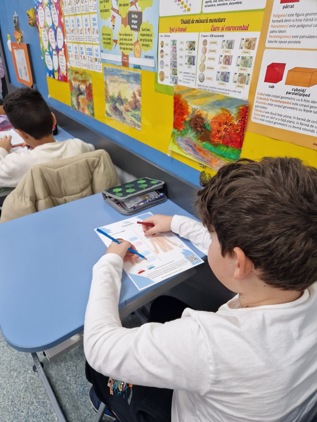 Copilul pleacă acasă cu o fișă. Așa cum spuneam la început, acest program este un dialog între noi, copil și părinte. Această fișă este completată de copil în timpul orei (workshopului – n.red.), cât el stă cu colegul nostru, iar apoi mai departe părintele are el de luat această temă pentru acasă, pentru a face evaluarea copilului.
