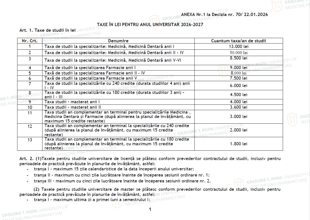 Taxele de studii (exprimate în lei) sunt valabile pentru anul universitar 2026-2027 la Universitatea de Medicină și Farmacie „Grigore T. Popa” din Iași, după cum urmează: