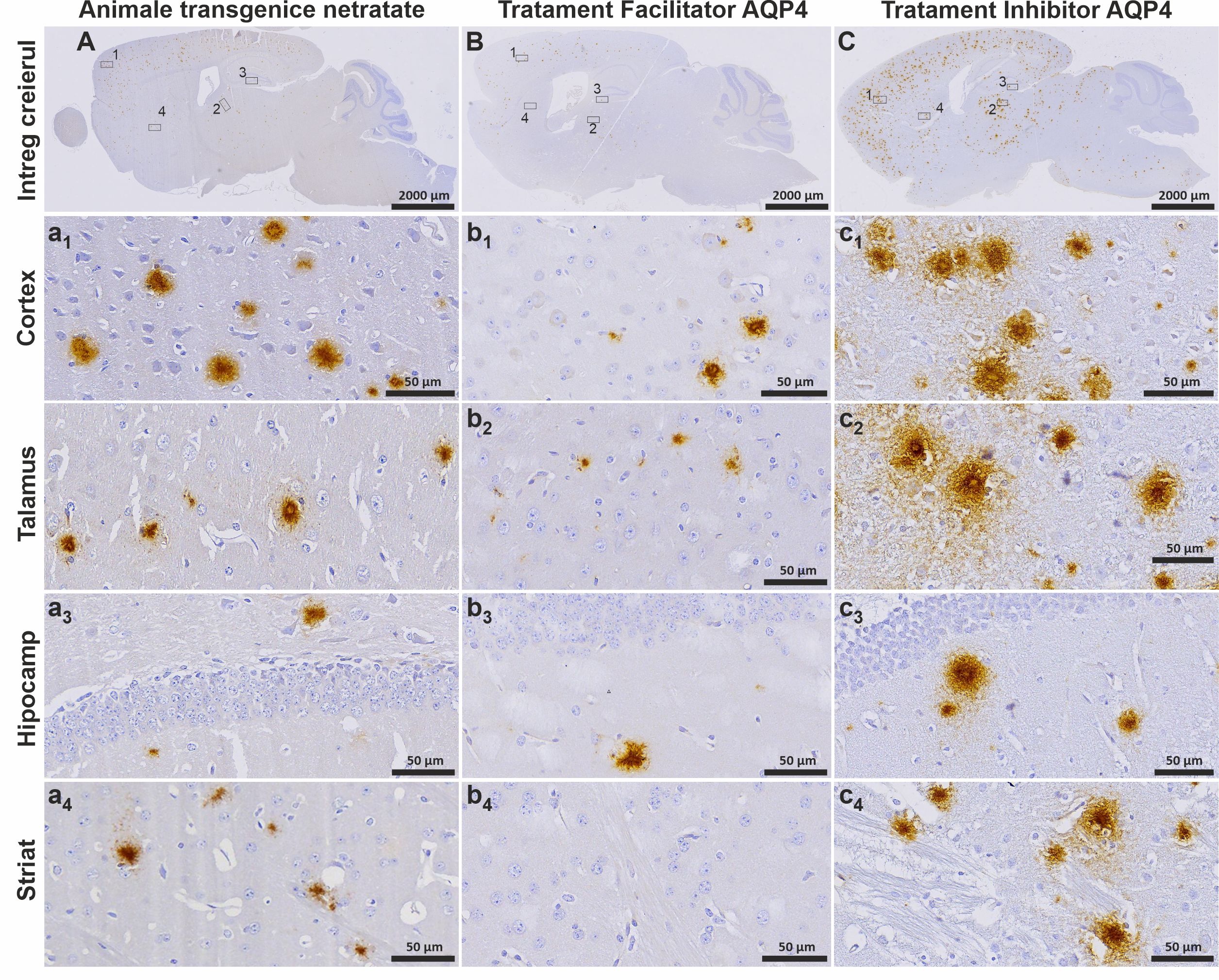 • Tratamentul cu facilitatorul de AQP4 a dus la o reducere marcată a depozitelor de amiloid în creierul animalelor, a îmbunătățit memoria și a redus anxietatea acestora, comparativ atât cu animalele transgenice netratatate, cât și cu cele tratate cu inhibitorul de AQP4.