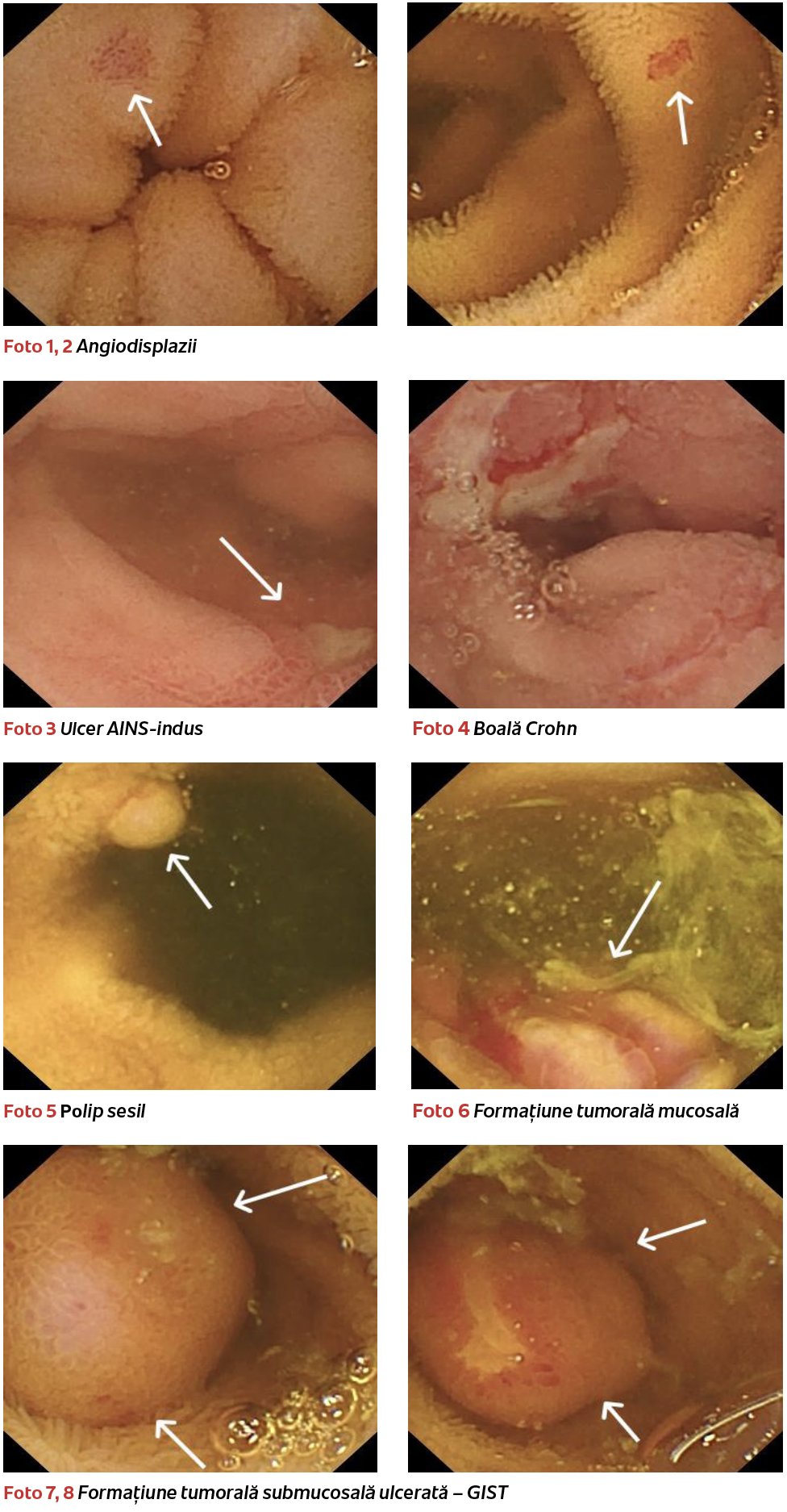 În ceea ce privește leziunile maligne sau cu potențial malign, cele mai frecvente sunt polipii enterali (Foto 5), formațiunile tumorale mucosale (Foto 6) și submucosale (Foto 7, 8).